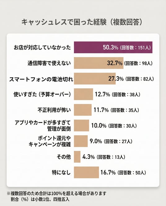 キャッシュレス決済で困った経験を聞いたところ(複数回答)、「お店が対応していなかった」が50.3%(151人)で最多となりました。次いで、通信環境や端末の状態など、インフラ・機器に起因するトラブルが上位に挙がりました。