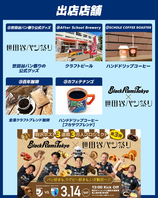この度ブラックラムズ東京では、3月14日(土)に駒沢オリンピック公園総合運動場陸上競技場で開催するNTTジャパンラグビー リーグワン 2025-26 第11節 静岡ブルーレヴズ戦にて、世田谷パン祭りとのスペシャル企画を実施します。