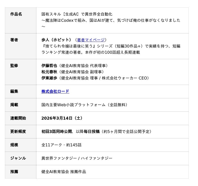 健全AI教育協会の伊藤哲也(代表理事)・松元春秋(副理事)・伊東雄歩(理事)が監修するWeb小説『固有スキル【ChatGPT】で異世界全自動化』が、2026年3月14日(土)より国内主要Web小説プラットフォームにて毎日投稿で連載を開始いたします。本作は、異世界ファンタジーのエンターテインメント性とAIリテラシー教育を融合させた新しい試みです。ハルシネーション、プロンプトエンジニアリング、AI失業、教育崩壊、AI倫理--現実世界で議論されるAIの論点を、全147話・11アークの壮大な冒険物語に織り込みました。