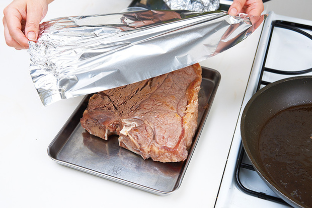 弱火で両面を焼いた後、一度取り出し、ホイルをかぶせて温かいところに置く。焼き時間と同じだけの時間、休ませることがポイント。