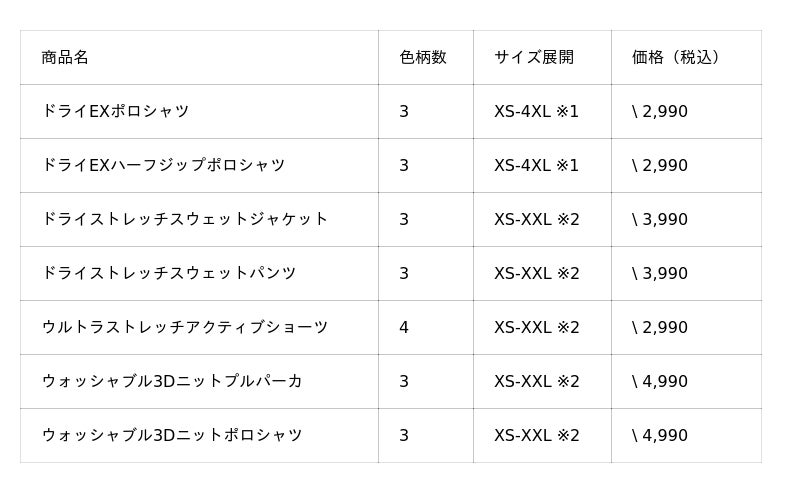 ※1 XS, XXL - 4XLはオンラインストアのみ展開