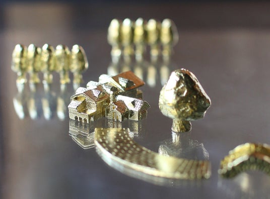 開館30周年にあわせて大山崎山荘(当館本館)をモティーフに制作された、真鍮オブジェ「山の美術館」