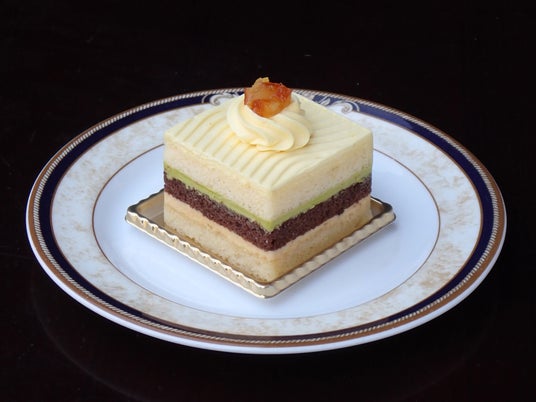 【ガトー・トリコロール】河井寬次郎《三色打釉手壺》のイメージで制作。白と黒(ココア)のスポンジにピスタチオクリームとキャラメルクリームをサンドし、表面は酸味のあるオレンジのクリームで仕上げました。トッピングにはオレンジピールを使用しています。