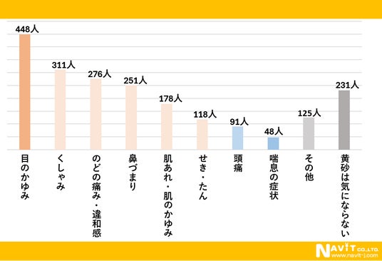 「黄砂によってどのような健康被害がありましたか?」という質問を複数選択可で行ったところ、「目のかゆみ」が448人、「くしゃみ」が311人、「のどの痛み・違和感」が276人と続きました。目のかゆみやくしゃみなどの、アレルギー症状に悩まされている人が多いようですね。
