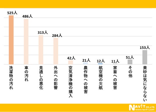 「黄砂によって生活にどのような影響がありましたか?」という質問を複数選択可で行ったところ、「洗濯物の汚れ」が525人、「車の汚れ」が486人、「見通しの悪化」が313人という順になりました。洗濯物や車の汚れが気になっている人が多いようです。