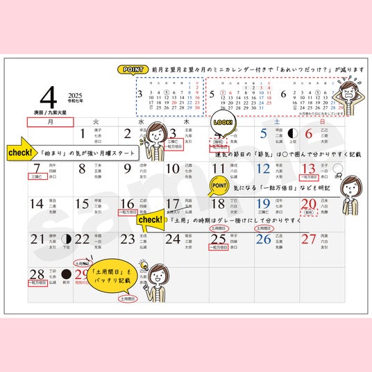 六曜・干支・九星・土用・二十四節気・一粒万倍日・天赦日などの暦情報を掲載した人気カレンダーシリーズ。卓上版に加え、より多彩な暦情報を収録した壁掛け版も展開しています。