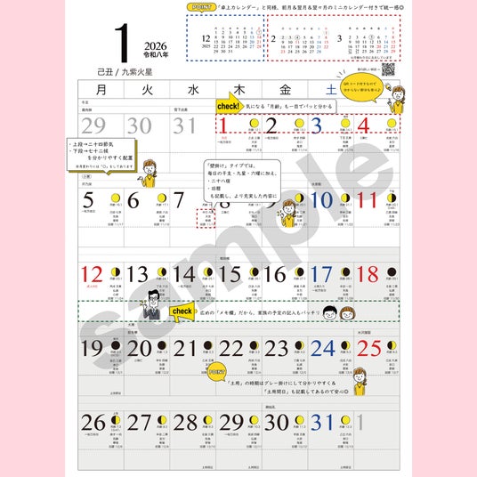 壁掛版は、六曜、干支、九星、宿曜、土用・土用間日、二十四節気、七十二候、月相、月齢、旧暦、一粒万倍日、天赦日、三隣亡を網羅。