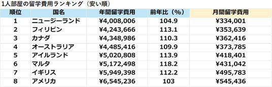 プライベート空間を重視する社会人留学で最も選ばれる「1人部屋」。2026年度のランキングでは、ニュージーランドがフィリピンを抜き、最も費用を抑えられる国となりました。 多くの国で費用が高騰する中、ニュージーランドは前年比106.8%の上昇に留まっており、落ち着いた環境で学び直したい大人世代にとって、今最も「狙い目」の国といえます。
