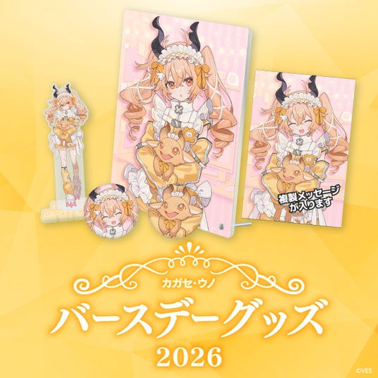 本日・3月12日に誕生日を迎えたカガセ・ウノのバースデーグッズの詳細を公開するとともに、公式オンラインショップ「VEE Official Shop」にて受注販売を開始しました。