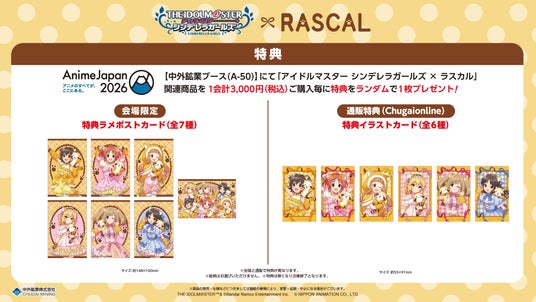 中外鉱業ブースにて『アイドルマスター シンデレラガールズ × ラスカル』AnimeJapan 2026関連商品を1会計3,000円(税込)ご購入毎に、特典ラメポストカード(全7種)をランダムで1枚お渡しいたします!
