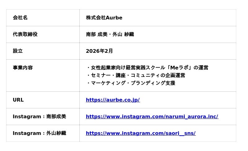 女性起業家向け経営実践スクール「Meラボ」を運営する株式会社Aurbe(代表:南部成美・外山紗織)は、2026年4月開講に先立ち、SNS集客や経営戦略をテーマにした無料勉強会を2026年3月19日にオンラインで開催します。Webマーケティングと士業の専門知識を掛け合わせ、女性起業家が安定した経営を続けるための考え方を解説します。(https://aurbe.co.jp/)