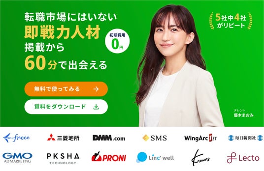 転職マーケットにいない即戦力人材を最短1日で見つけることができる、最速のフリーランス・副業マッチングプラットフォームです。20代後半~40代前半のIT領域に強いエンジニア、マーケター、セールス、BizDev、UI・UXデザイナーの5職種を中心に、最近ではAIエンジニア、AIコンサルタントなども増えております。また、スタートアップや上場企業との取引も増え、正社員で即戦力人材を採用したくても「採用するまで何か月も時間を要する」「スカウトメールの反応率が下がってきている」といったお悩みを持つ採用担当者様の課題解決のためのサービスを提供しております。