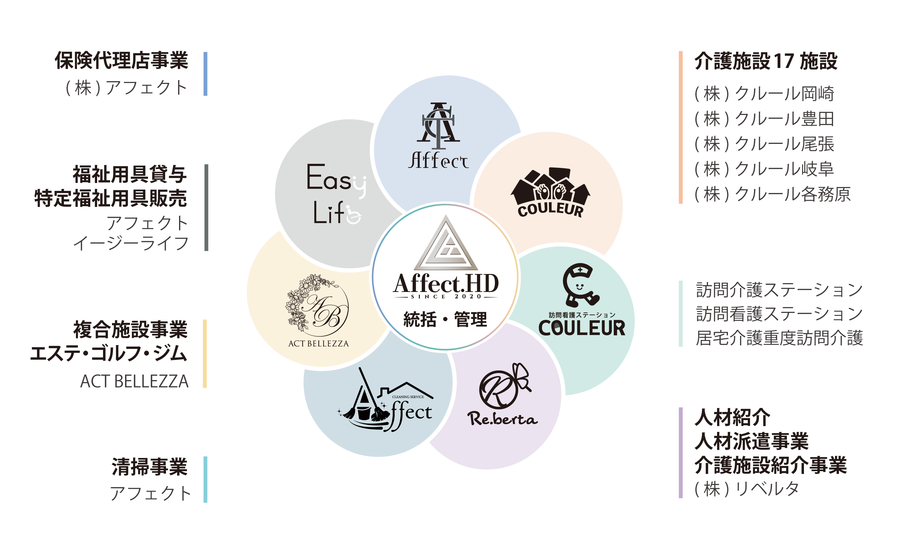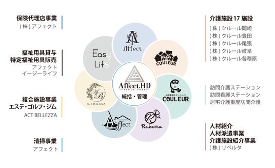サービス付き高齢者向け住宅や住宅型有料老人ホームなど介護施設17施設をはじめとしてパーソナルジム、インドアゴルフ、エステなどを運営。 2011年岡崎市に(株)ビバントとして愛知県岡崎市に創業。介護施設を中心に店舗展開を続け、2024年複合施設ACT BELLEZZAをオープン。企業理念の「Happiness A Lot」をキーワードに事業展開を続ける。