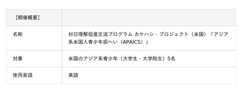 本プログラムは、外務省が推進する国際交流事業「対日理解促進交流プログラム」カケハシ・プロジェクト(米国)の一環で行われる招へいプログラムです。