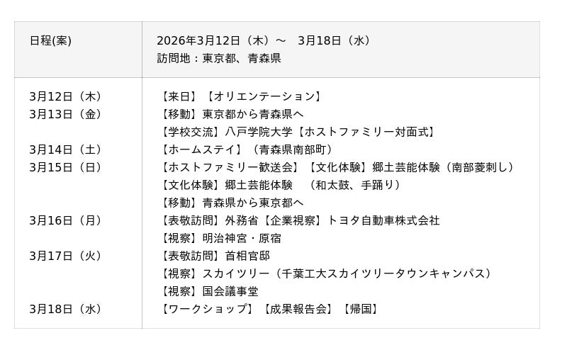 青森県では、学校交流を通じて互いへの理解を深め、友情を育みます。さらにホームステイでは、日本の暮らしや文化を体験的に学びます。こうした一連の経験を通じて、日本の文化や社会への理解を深め、自らの学びや気づきを発信していきます。