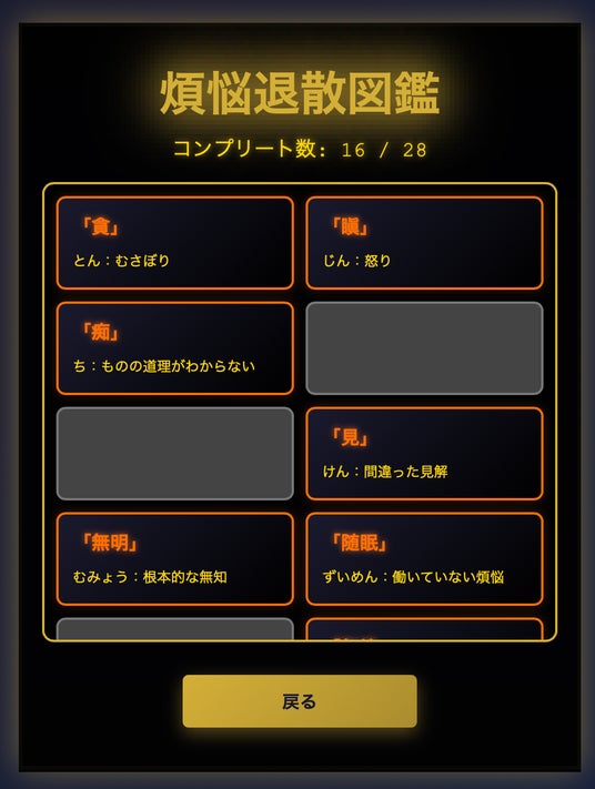 いきます。クリア毎に解放される仏教用語や経典ワードを収集し、プレイしながら仏教用語の意味を