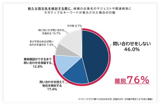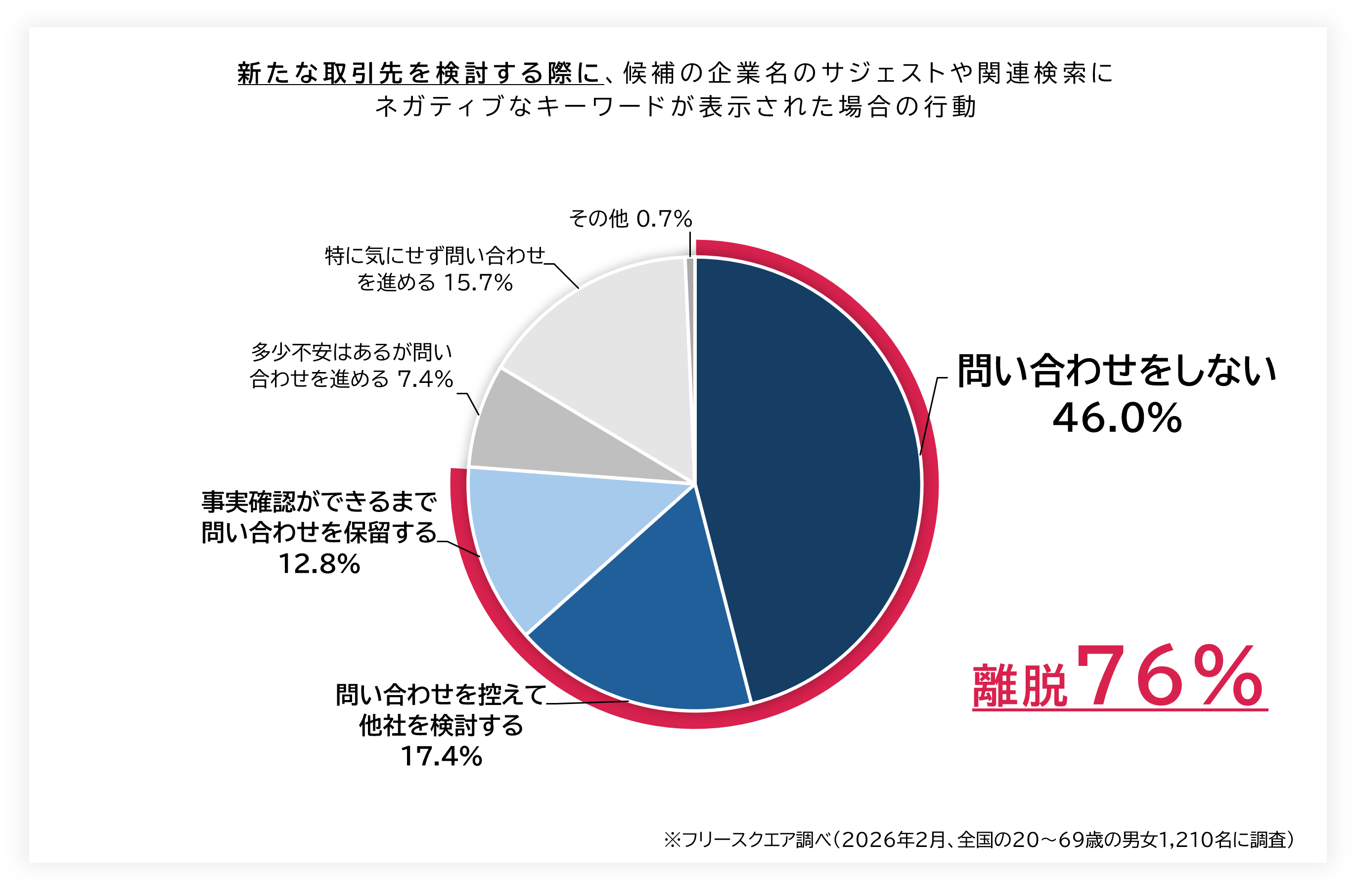その結果、検索結果にネガティブワードが表示されるだけで、最大約80%が行動を控えることが明らかになり、検索結果が企業の第一印象を左右し、問い合わせ・採用・取引・既存顧客など企業活動全体に影響を及ぼす 「検索リスク」 の存在が浮き彫りとなりました。