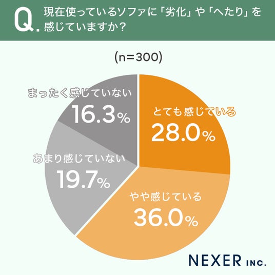 その結果「とても感じている」が28.0%、「やや感じている」が36.0%となり、合わせて64.0%の方がソファの劣化やへたりを実感していることがわかりました。一方「あまり感じていない」は19.7%、「まったく感じていない」は16.3%にとどまっています。