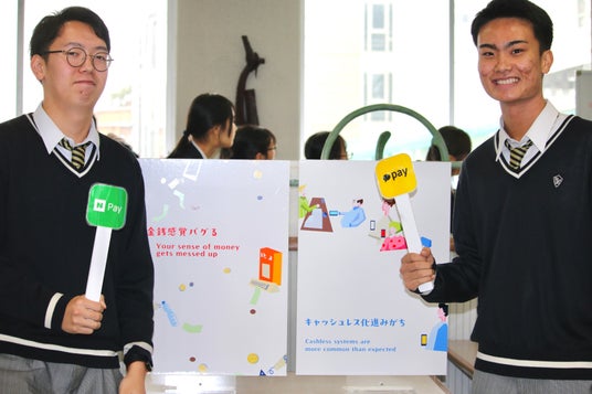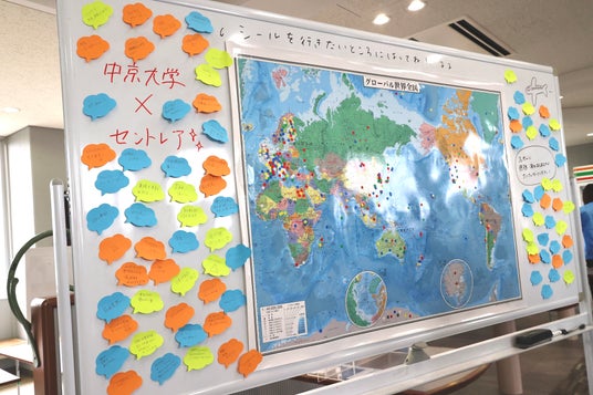 行きたい国にシールを貼る高校生と海外への印象を聞く大学生