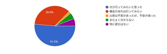 高校生を対象に「このイベントを通して海外に対する気持ちはどう変わりましたか?」と質問したところ、約87%の学生が『海外に行きたいと思った』と回答し、展示を通じて海外への関心が大きく高まったことが明らかになりました。