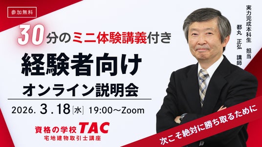 宅建士試験対策講座を展開しているTAC株式会社(東京都千代田区、代表取締役:多田敏男)は、3/18(水)19:00より宅建試験の受験・学習経験者向けの無料オンラインセミナーを開催します。