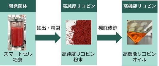 ハリマ化成は、菌体からリコピンを工業的に回収・精製するためのプロセス構築を進め、従来の植物抽出法や石油由来の合成法に比べ、CO2排出量の削減に寄与するだけでなく、食料との競合を回避できる利点も持った製造プロセスを開発しました。
