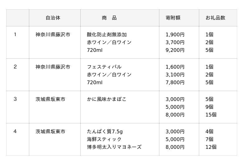 新生活を迎える春、おいしさや健康を意識した“からだ想い”な6商品を「ファミマふるさと納税」に追加いたします。食卓を華やかに彩る「酸化防止剤無添加ワイン(神奈川県藤沢市)」に加え、手軽にたんぱく質補給ができる「たんぱく質7.5g海鮮スティック 博多明太入りマヨネーズ(茨城県坂東市)」や「かに風味かまぼこ(茨城県坂東市)」が登場します。お礼品全体では、34自治体105商品に拡大し、日常使いの商品がさらにご利用いただきやすくなりました。