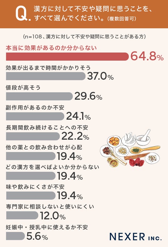 漢方に対する不安は、とくに「効果が見えにくいこと」に集まっているようです。