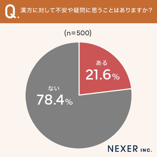 「ない」と回答した方は78.4%で多数を占めました。一方で「ある」と回答した方も21.6%おり、約2割の方が漢方に何らかの不安や疑問を抱えていることが分かります。