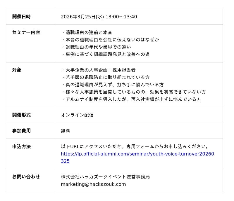 この問題の解決へのヒントとして、この度人事企画・組織開発ご担当者様向けに、退職者のリアルな声を経営資産に変え、強い組織づくりに活かすための具体策を解説するセミナーを開催いたします。貴社の組織課題の発見・改善に向けて、ぜひお申し込みください。