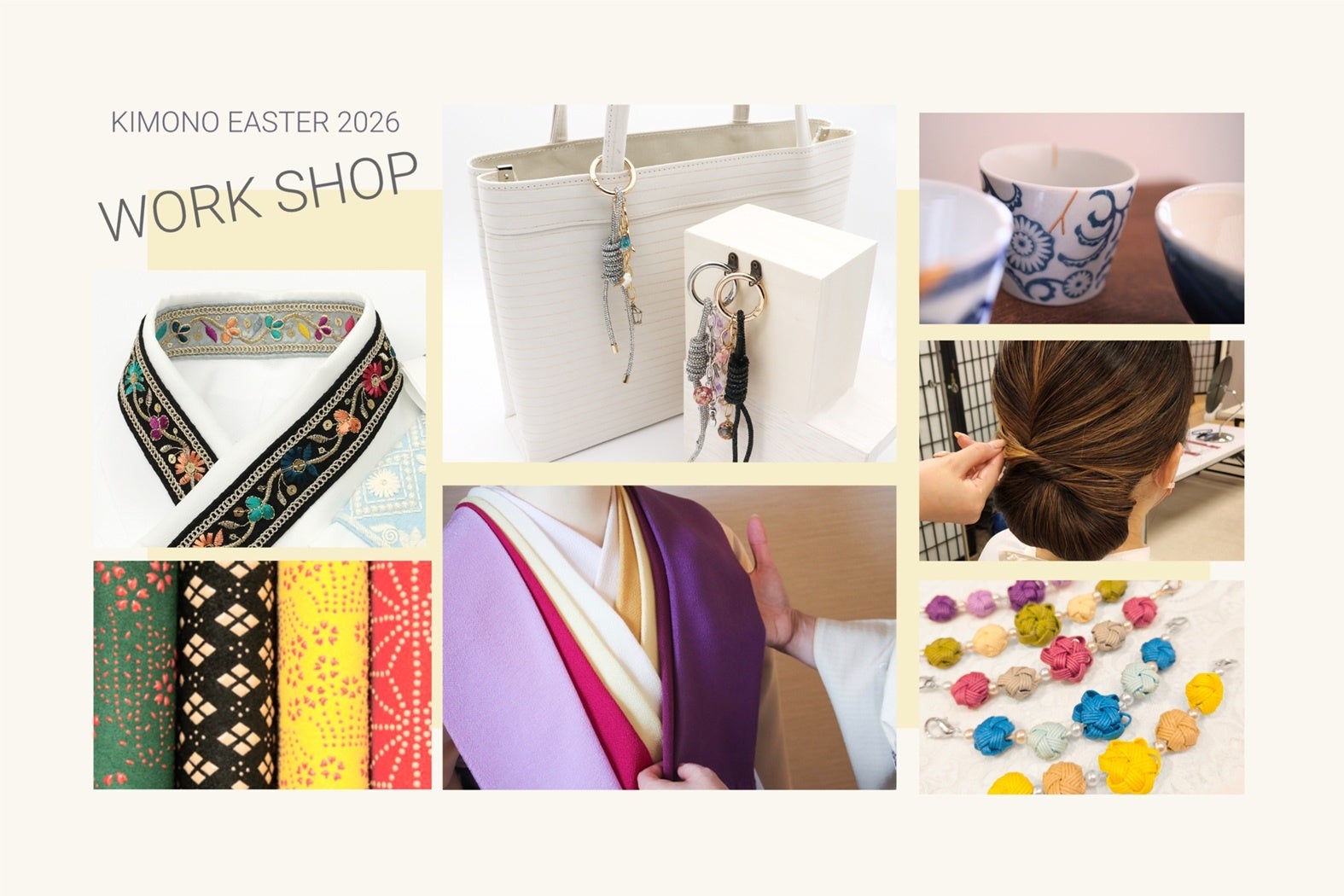 また、「金継ぎ」「印伝型染体験」「着物パーソナルカラー診断」や、オリジナルの帯留、羽織紐、半衿などを作る和のワークショップなども同時開催!