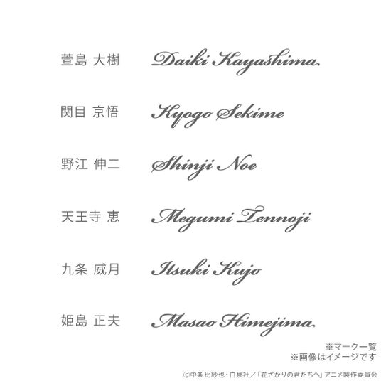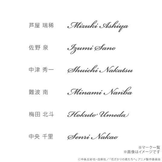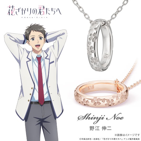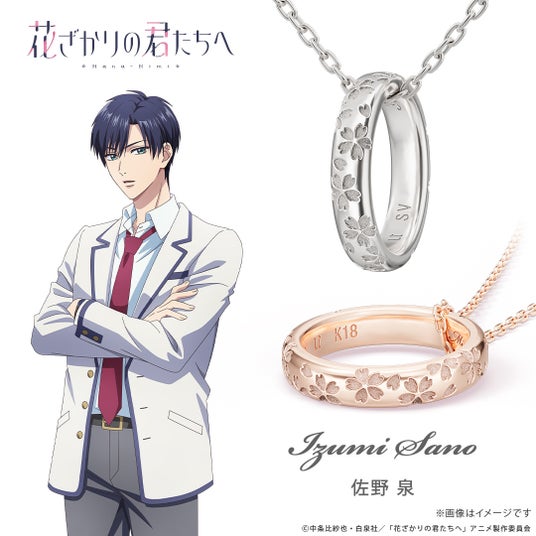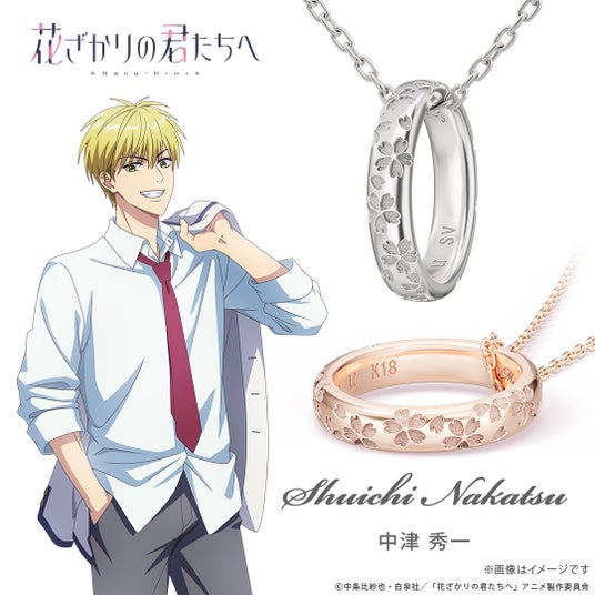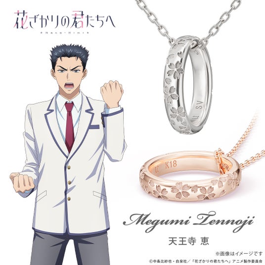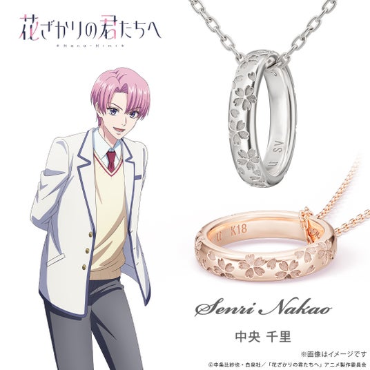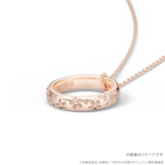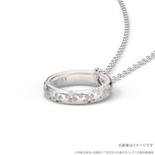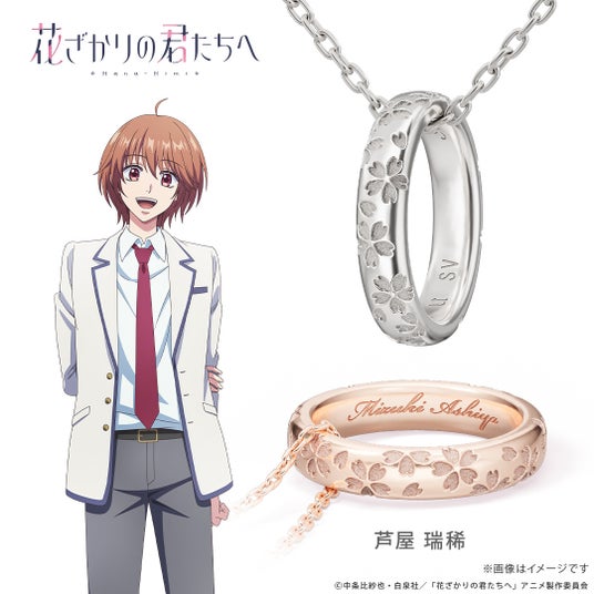 このたびの新作は、アニメ「花ざかりの君たちへ」の作品ロゴやキービジュアルをイメージしたデザインのリングネックレスです。内側には12名の中から選んだキャラクターの名前を英語で刻印します。