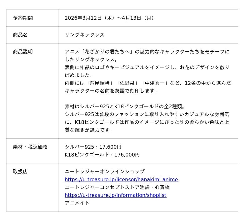 株式会社ユートレジャー(本社:東京都新宿区、代表取締役社長:青木 興一、株式会社ケイ・ウノの連結子会社)は、アニメ「花ざかりの君たちへ」とのコラボレーションアイテム「リングネックレス」の予約受付を2026年3月12日(木)~4月13日(月)の期間、ユートレジャーオンラインショップ、ユートレジャーコンセプトストア池袋・心斎橋にて行います。