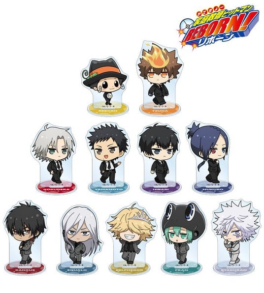 リボーン、沢田 綱吉、獄寺 隼人(10年後)、山本 武(10年後)、雲雀 恭弥(10年後)、六道 骸(10年後)、XANXUS(10年後)、スペルビ・スクアーロ(10年後)、ベルフェゴール(10年後)、フラン、白蘭の描き起こしちびキャライラストをメインにデザインし、アクリルスタンドに仕上げました。