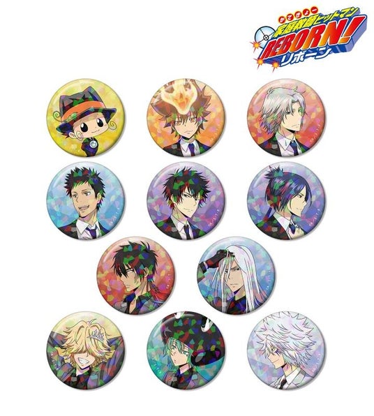 リボーン、沢田 綱吉、獄寺 隼人、山本 武、雲雀 恭弥、六道 骸(10年後)、ディーノ(10年後)、XANXUS(10年後)、スペルビ・スクアーロ(10年後)、ベルフェゴール(10年後)、フラン、白蘭のイラストを新たなタッチで魅力的に表現し、ホログラム加工を施した缶バッジに仕上げました。