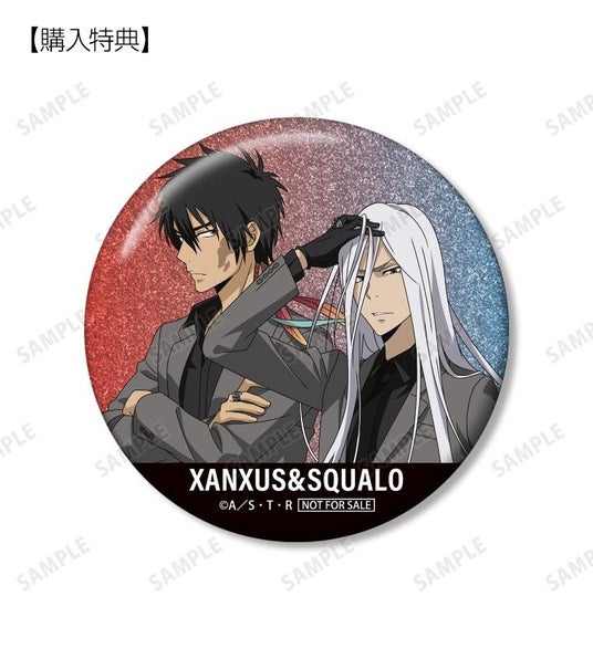 当商品を1BOX、または単品にて1BOX相当数ご注文ごとに、予約購入特典として「描き下ろし XANXUS(10年後)&スペルビ・スクアーロ(10年後) スーツの歩みver. 75mmグリッター缶バッジ AMNIBUS&アニメイト限定特典」を付属いたします。