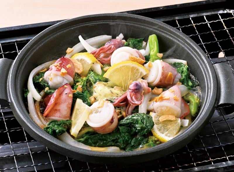 春小イカと菜の花のガリバタ陶板焼 698円(税込768円)