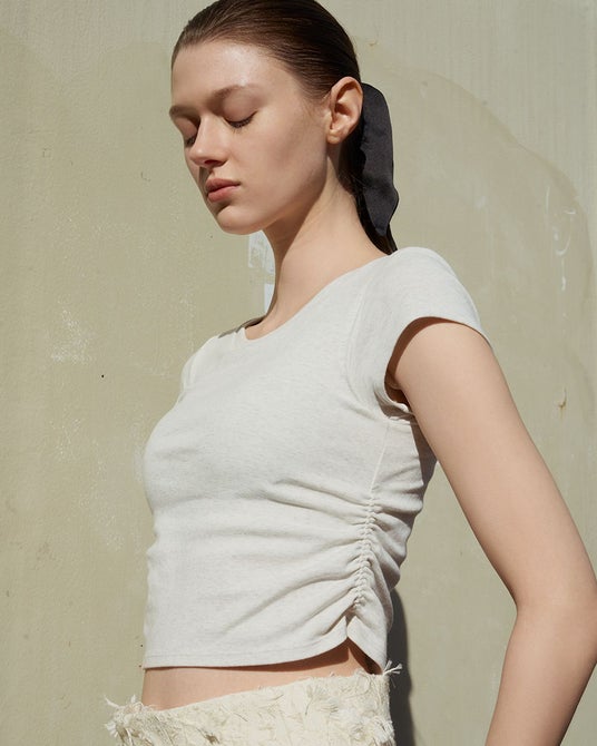 カップ イン サイドギャザーTジャストフィットなシルエットに、サイドギャザーで立体感をプラス。さりげない肌見せとスタイルアップを両立する、シンプルながらトレンド感抜群のデザインが魅力。正面の丈は少し長めに取っており、露出を抑えた絶妙なバランス感で着こなしやすい一枚。