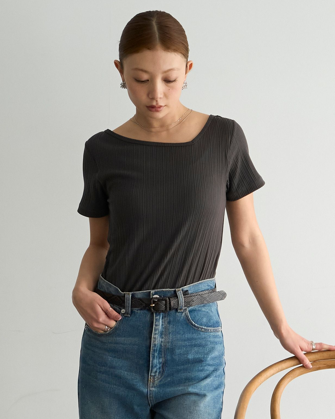 カップ イン アシンメトリー VネックTエッジの効いたアシンメトリーネックが目を引く一枚。鎖骨を美しく見せる絶妙な開き具合で、シンプルながらトレンド感を演出。落ち感ととろみのある素材が上品な印象を与え、1枚でさらりと決まる高いデザイン性と美しいシルエットが魅力。