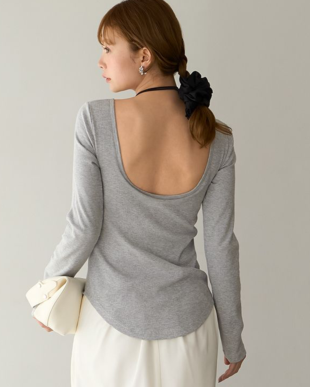カップ イン バックオープンT ロングシンプルなフロントと大胆なバックオープンで、ヘルシーな色気を演出。インナーに困りがちな背中開きでも、一枚でサラッと着られるのがポイント。いつものボトムと合わせるだけでトレンド感がUP。