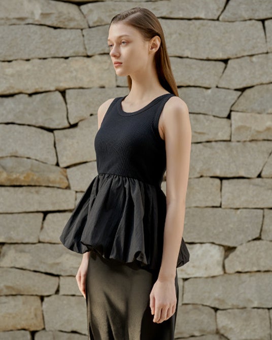 カップ イン バルーン タンクトップ上下で素材を切り替えたドッキングデザイン。ハリとボリュームのある裾バルーンが、お腹やヒップをふんわりカバー。高めの切り替え位置でスタイルアップも叶い、異素材使いがこなれた印象に。1枚でもレイヤードでも映える主役級の一着。