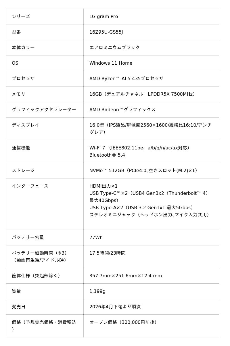 LGエレクトロニクス・ジャパン株式会社(代表取締役:孫 成周(ソン・ソンジュウ) 本社:東京都中央区)は、高性能かつ壮観な大画面を軽快に持ち運べるフラッグシップモデル「LG gram Pro」の2026年ラインナップ追加モデルとして、16インチで1,199g(※1)の軽さと12.4mm(突起部除く)の薄さを実現し、AMD Ryzen(TM) AIプロセッサを搭載した「LG gram Pro 16」(16Z95U-GS55J)を、2026年4月下旬より順次発売します。