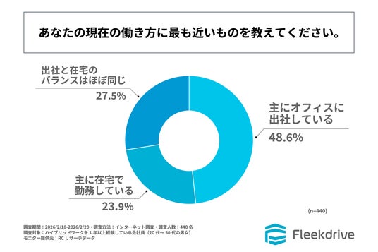 ハイブリッドワークを1年以上経験している会社員の約半数が、現在は「主にオフィスに出社している」と回答