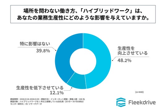 近年、オフィスや自宅、サテライトオフィスなど、複数の拠点を使い分けて業務を行うハイブリッドワークが普及し、定着しつつあります。この働き方の変化が従業員の生産性にどのような影響を与えているのか、その意識に注目が集まっています。こうした新しい働き方が定着する中で、効率的な運用を実現するには、情報の可視化、コミュニケーションの質の維持、そしてITツールの高度な活用が不可欠とされています。企業側は生産性向上への期待を抱く一方、現場の従業員からはコミュニケーション不足や周囲からの評価の難しさといった懸念の声も聞かれます。そこで、株式会社Fleekdriveは、ハイブリッドワークを1年以上経験している会社員を対象に、「ハイブリッドワークにおける生産性に関する調査」を実施しました。<調査サマリー>