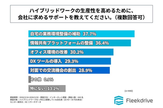調査の最後、「ハイブリッドワークの生産性を高めるために、会社に求めるサポートは何か」を尋ねる設問への回答では、1位が「自宅の業務環境整備の補助」で37.7%、2位が「情報共有プラットフォームの整備」で36.4%、3位が「オフィス環境の改善」で30.2%という結果になりました。この結果から、ハイブリッドワークの生産性を高めるために会社に求める主なサポートは、「自宅の業務環境整備の補助」や「情報共有プラットフォームの整備」であることが明らかになりました。