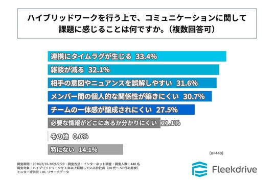 次に、ハイブリッドワークを1年以上経験している会社員を対象に「ハイブリッドワークを行う上で、コミュニケーションに関して課題に感じることは何か」を尋ねる設問への回答では、1位が「連携にタイムラグが生じる」で33.4%、2位が「雑談が減る」で32.1%、3位が「相手の意図やニュアンスを誤解しやすい」で31.6%という結果になりました。この結果から、ハイブリッドワークを1年以上経験している会社員が、ハイブリッドワークを行う上で、コミュニケーションに関して課題に感じることで最も多いのは、「連携にタイムラグが生じること」であることがわかりました。
