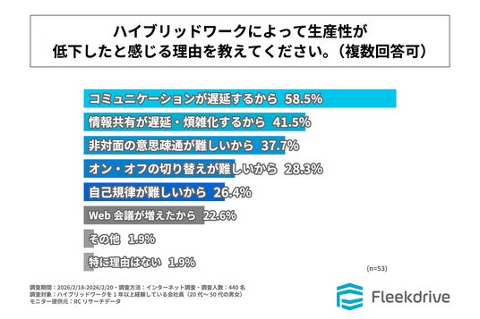 - ハイブリッドワークによって生産性が低下したと感じる主な理由は、「コミュニケーションが遅延するから」や「情報共有が遅延・煩雑化するから」