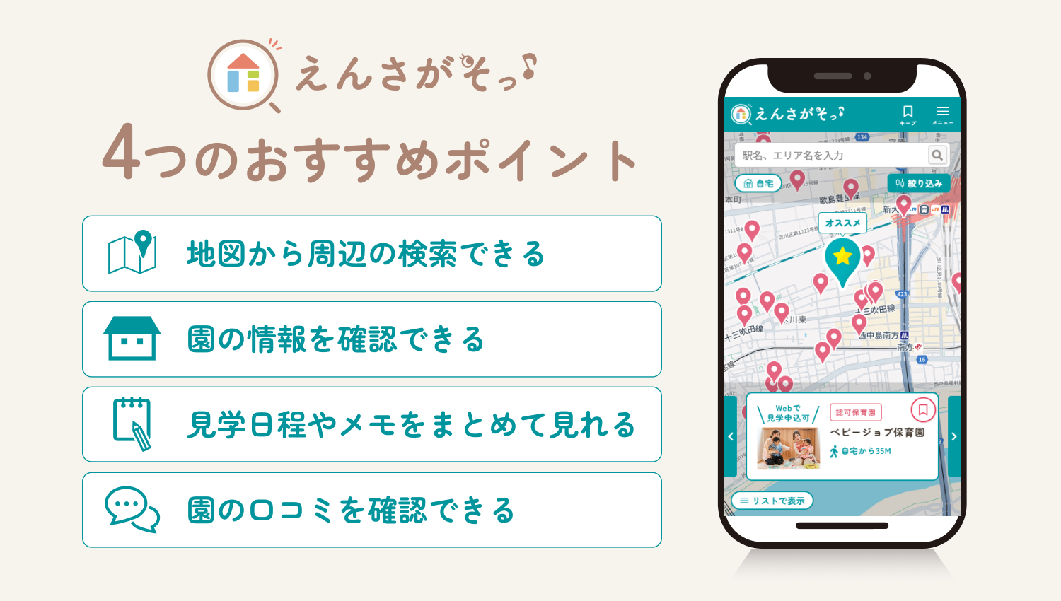 えんさがそっ♪は、保護者がスマホを使って片手で簡単に「保活」を行える保育施設探しWebサイトです。