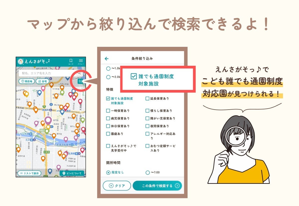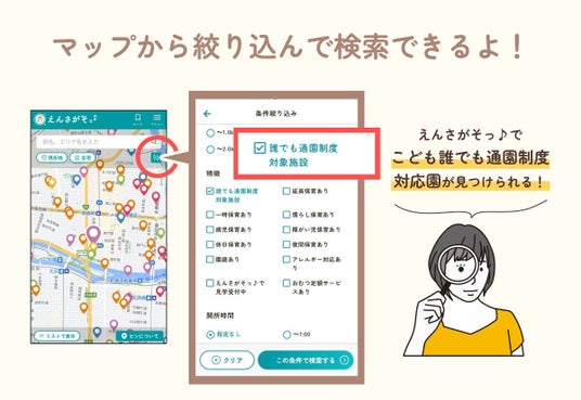 制度を実施している園を保護者が簡単に探せるよう、保育施設探しサイト「えんさがそっ♪」に検索機能を準備しています。