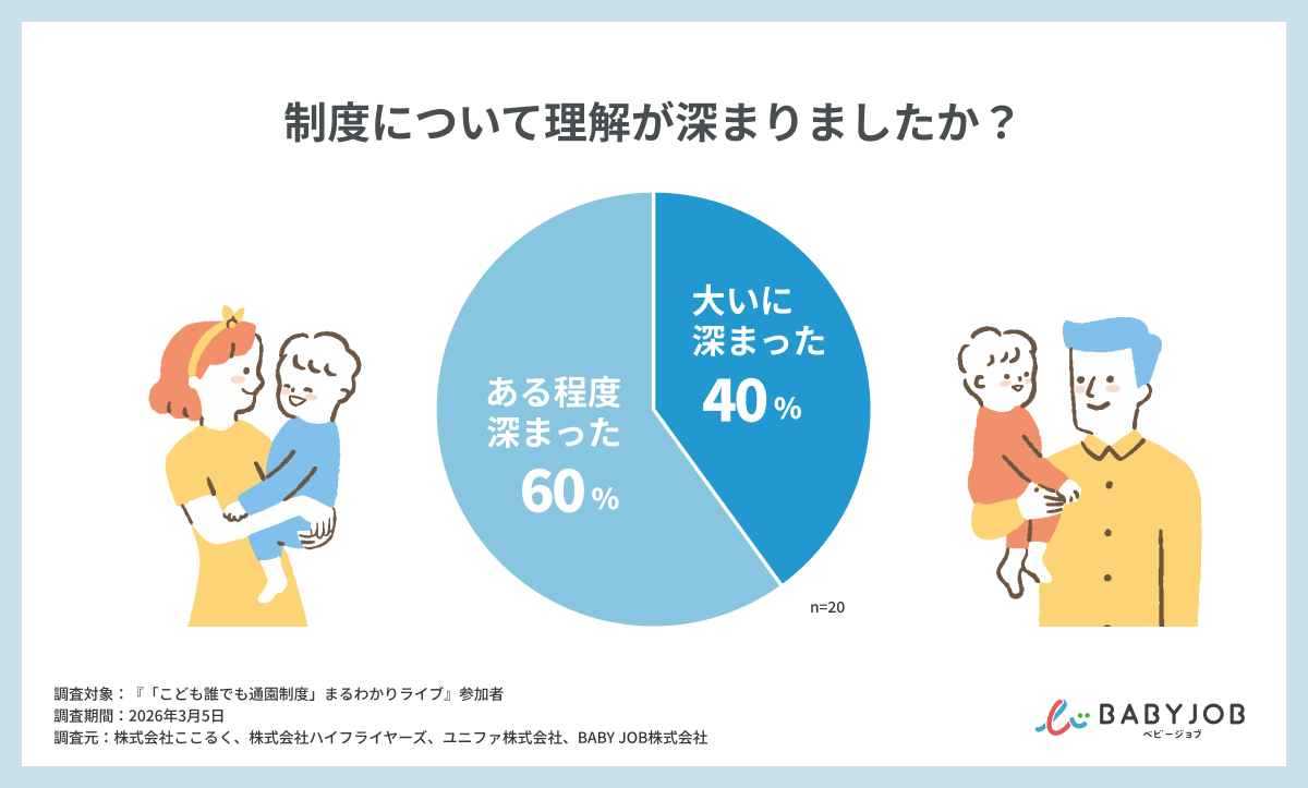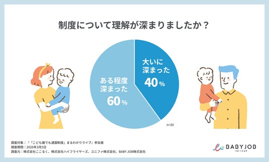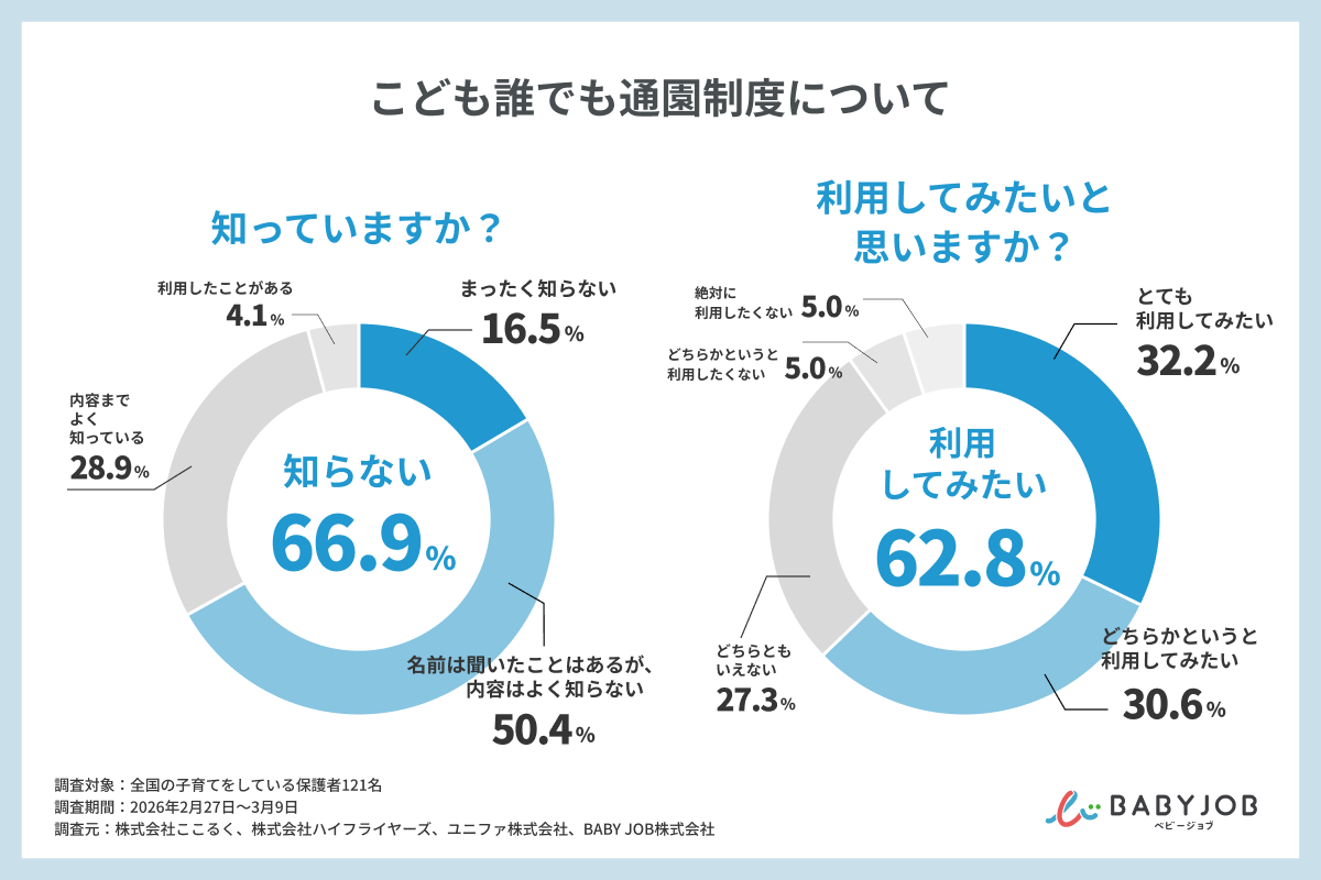 BABY JOB株式会社(本社:大阪府大阪市、代表取締役 上野公嗣)は、株式会社ここるく、株式会社ハイフライヤーズ、ユニファ株式会社と協働し、未就学児を持つ保護者121名を対象に、2026年4月に本格開始される国の制度「こども誰でも通園制度」に関するアンケート調査を実施しました。